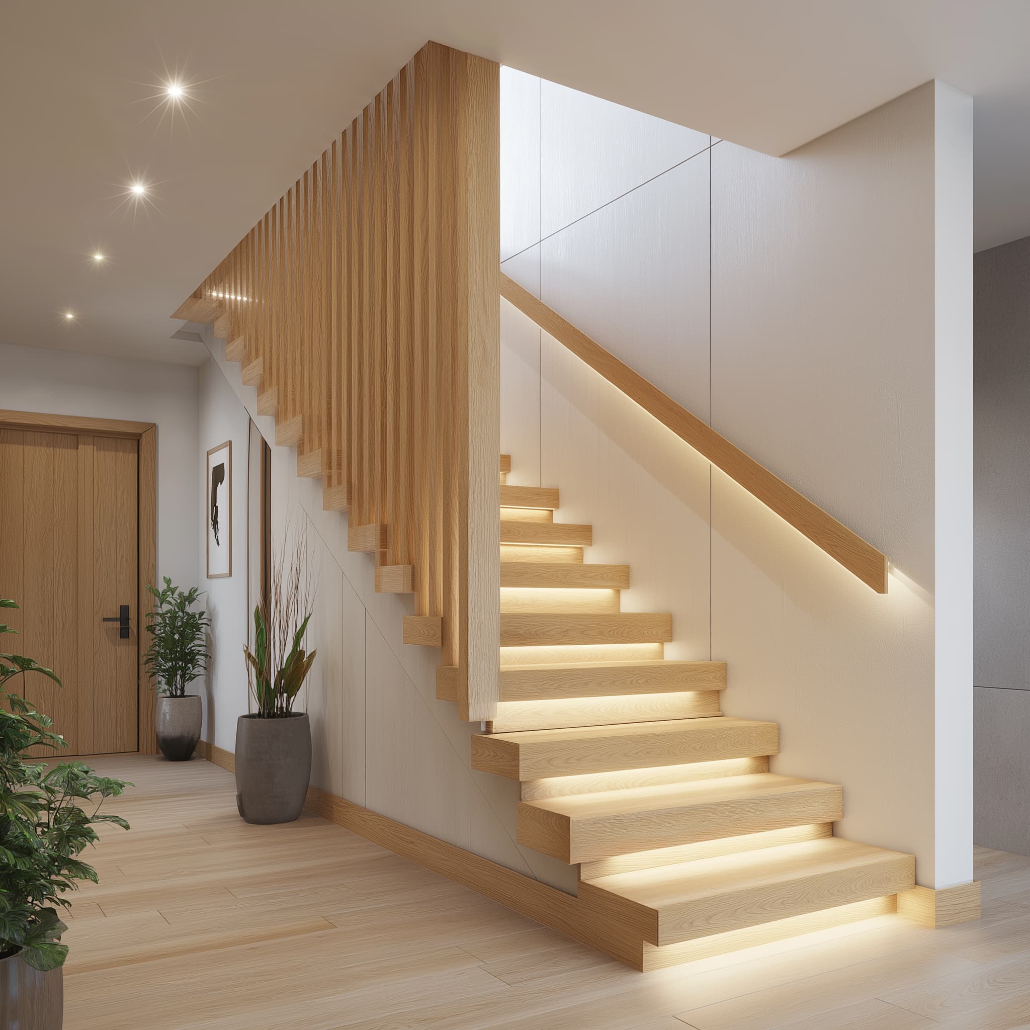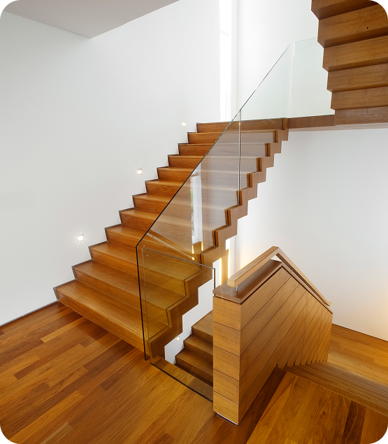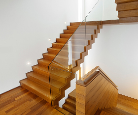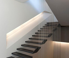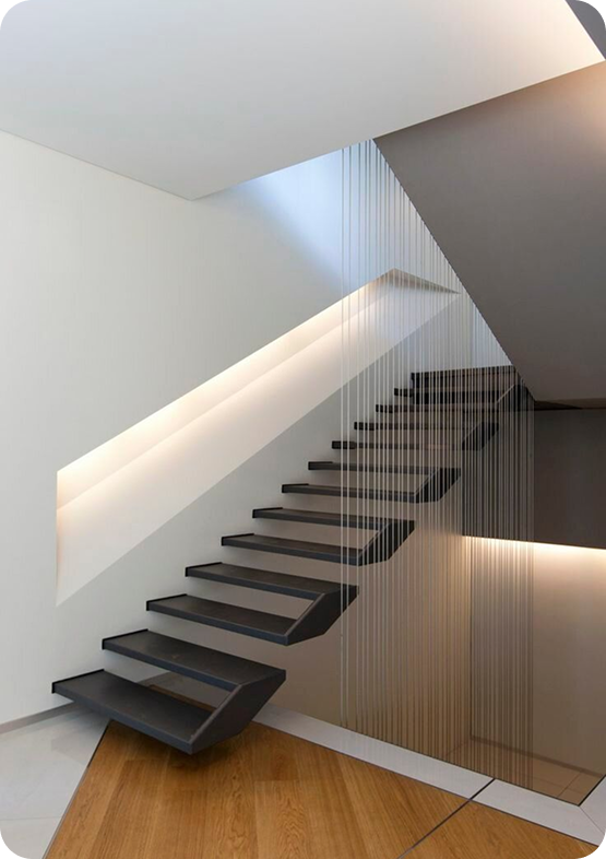 Конструкция, которая имеет опору только с одной стороны: обычно ступени напрямую прикреплены к стене, и по стене же идут поручни или перила. За счёт этого она выглядит лёгкой, воздушной и как будто парящей в воздухе